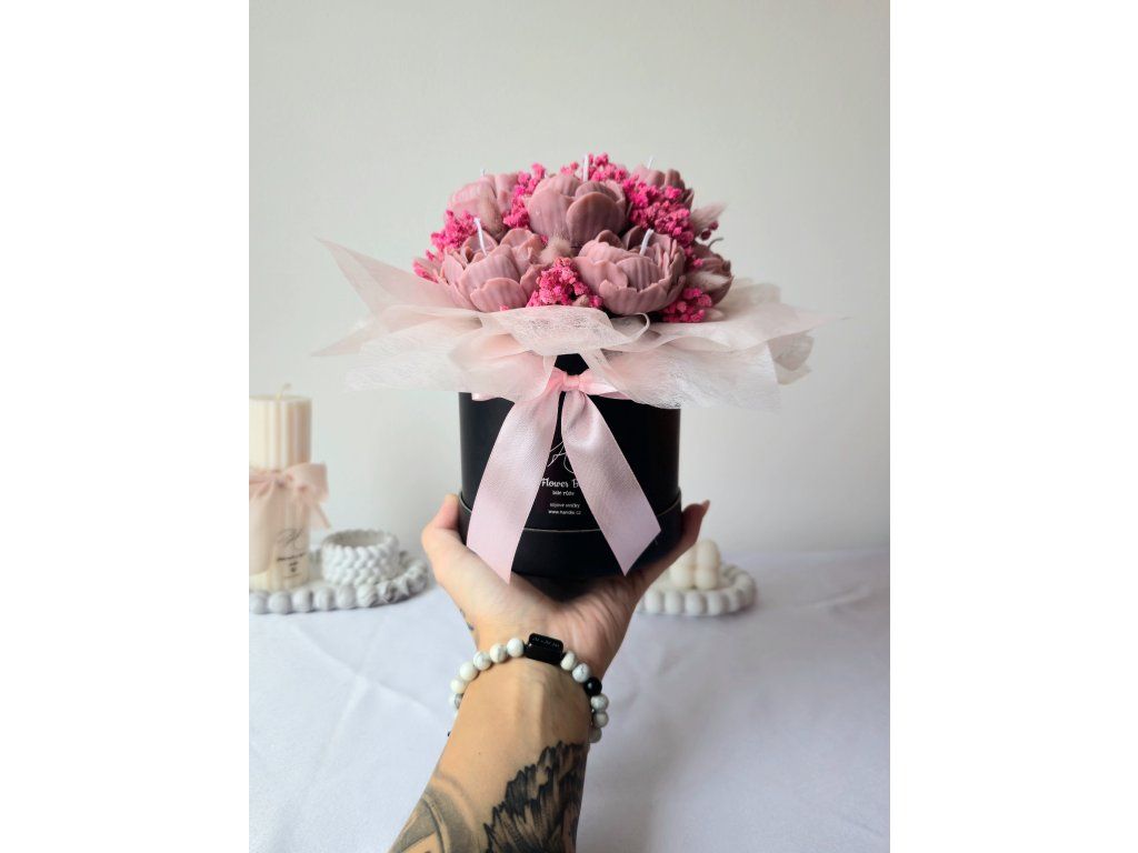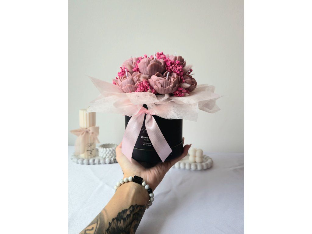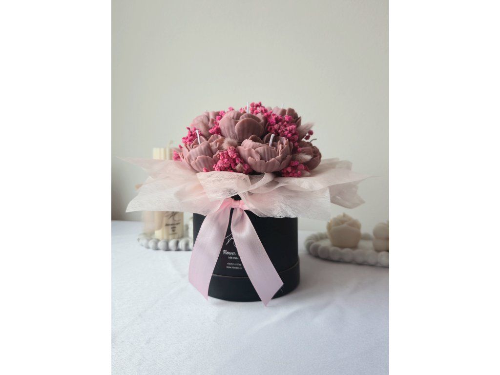 Luxusní flower box ze sójového vosku v elegantním provedení s jemnou mašlí. Dokonalý dárek, který spojuje krásu květin s kouzlem svíček. Sytost barvy produktu se může lehce lišit s ohledem na světlo v ateliéru nebo rozlišení Vašeho zařízení.