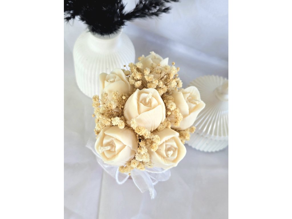 Krémově bílé tulipány z vosku jsou doplněny sušenými kvítky a naaranžovány do elegantního metalického boxu s mašlí. Tato dekorace potěší nejen svým vzhledem, ale i jemnou květinovou vůní, která navodí příjemnou atmosféru.