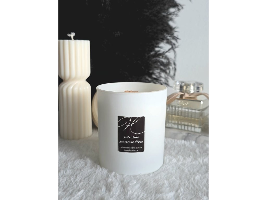 Ostružina a jantarové dřevo - Objem: 300 ml | Váha vosku: cca 230 g | Celková váha: cca 540 g