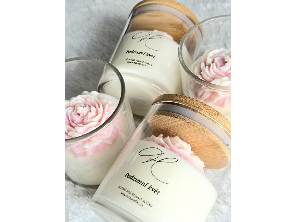 Každá svíčka je ručně lita z přírodního sójového vosku, doplněna o detailně tvarovaný květ, který promění svíčku v designový kousek i bez zapálení. Elegantní sklenice s dřevěným víčkem ji dělá krásným doplňkem i ideálním dárkem.