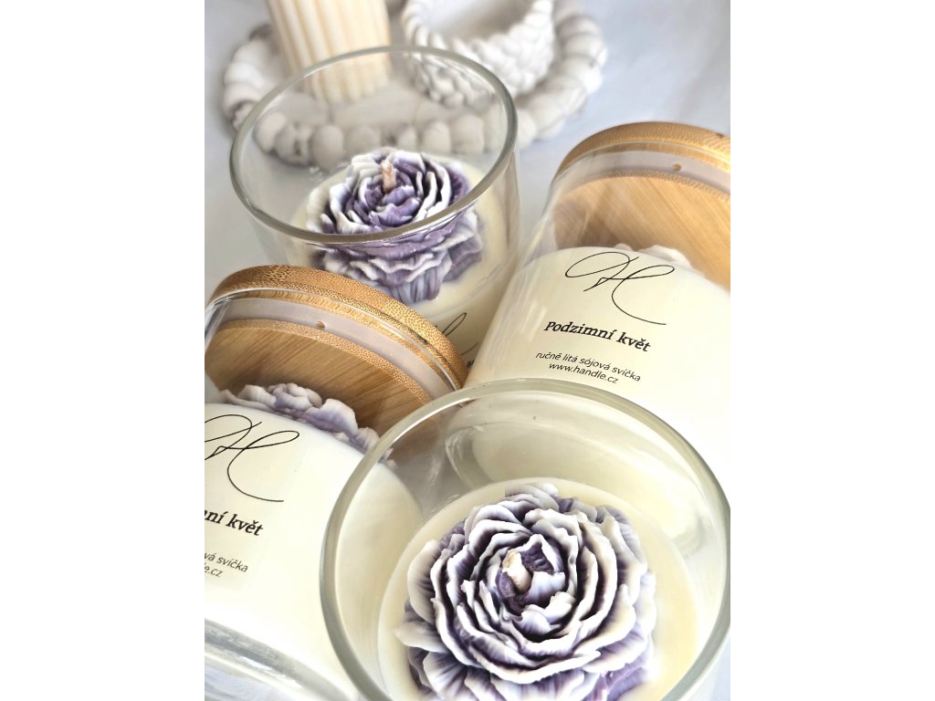 Každá svíčka je ručně lita z přírodního sójového vosku, doplněna o detailně tvarovaný květ, který promění svíčku v designový kousek i bez zapálení. Elegantní sklenice s dřevěným víčkem ji dělá krásným doplňkem i ideálním dárkem.