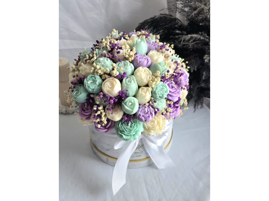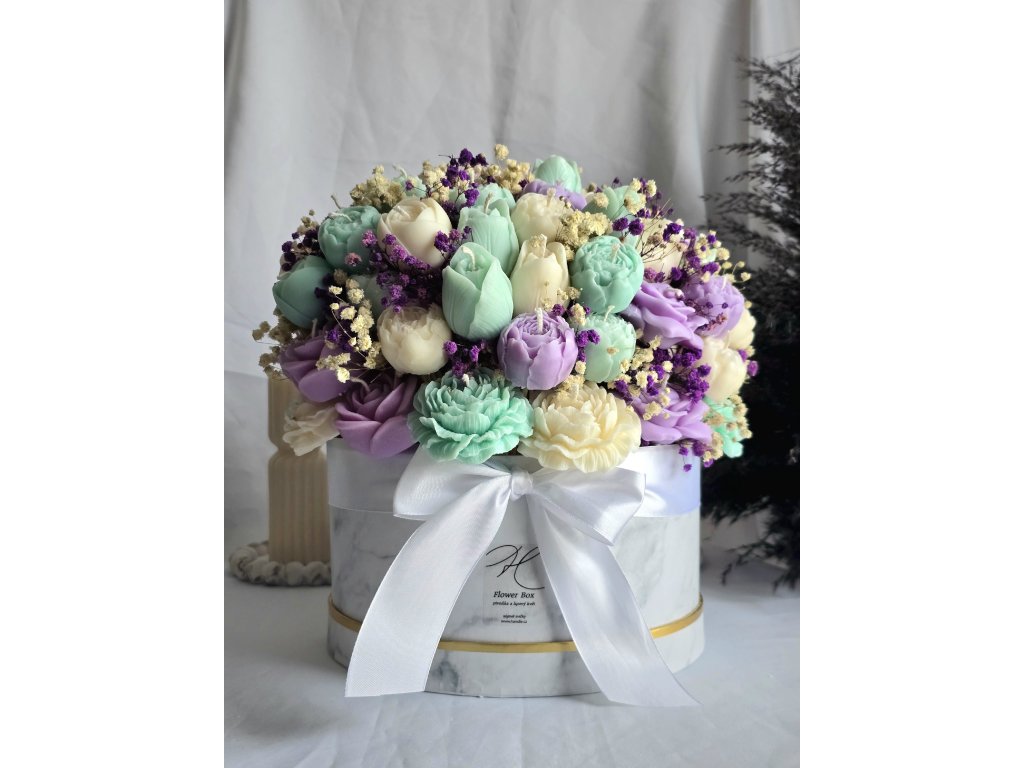 Tento jedinečný XXL Flower Box ukrývá 50–60 vonných sójových svíček, které vytvářejí nádhernou květinovou kompozici – elegantní, originální a zcela jedinečnou. Každá svíčka je ručně odlita ze 100% sójového vosku, doplněna o vonné oleje s certifikací IFRA a pečlivě tvarována do podoby realistických květů.